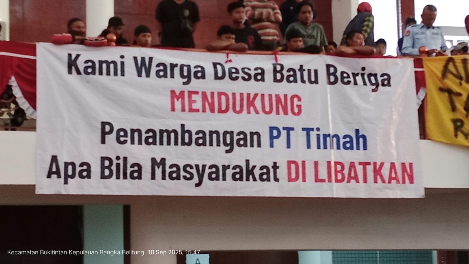 “Yang hadir di sini hari ini adalah warga asli Batu Beriga. Bukan berarti kami mendukung PT Timah, tapi kami juga tidak menolak tambang laut dan kami mendukung penambangan yang telah memiliki izin resmi,” katanya.