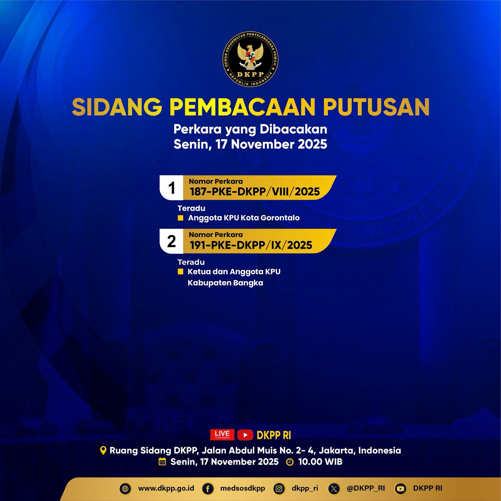 Putusan itu dibacakan dalam sidang kode etik terbuka untuk umum pada hari ini, Senin, tanggal 17 November 2025 oleh Heddy Lugito selaku Ketua merangkap Anggota; J Kristiadi, I Dewa Kade Wiarsa Raka Sandi dan Muhammad Tio Aliansyah masing-masing sebagai Anggota.