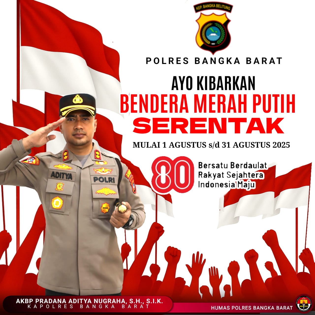 BANGKA BARAT – Menjelang peringatan Hari Ulang Tahun ke-80 Kemerdekaan Republik Indonesia tanggal 17 Agustus 2025, Kapolres Bangka Barat AKBP Pradana Aditya Nugraha, mengajak seluruh masyarakat Bangka Barat untuk mengibarkan bendera Merah Putih mulai tanggal 1 Agustus 2025.