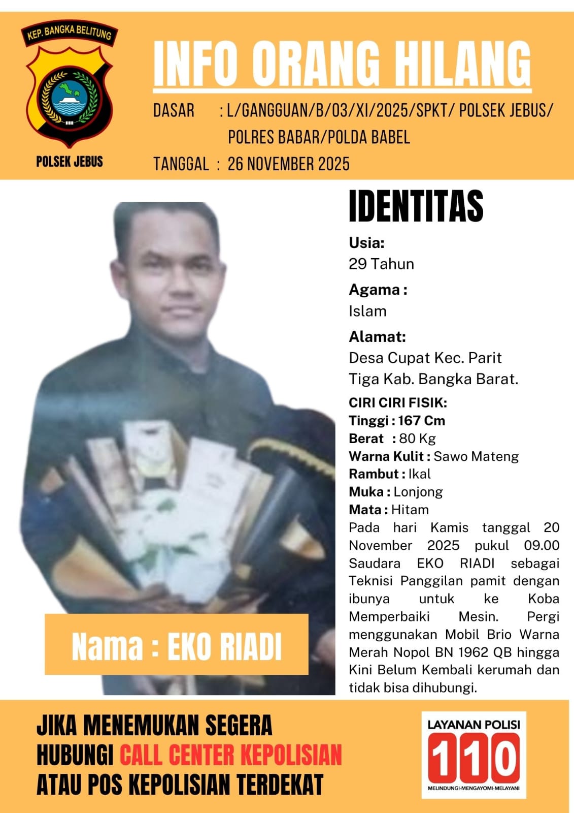 BANGKA BARAT – Polsek Jebus bergerak cepat menindaklanjuti laporan hilangnya Eko Riadi, warga Desa Cupat Kecamatan Jebus, yang tidak pulang sejak Kamis, 20 November 2025.
