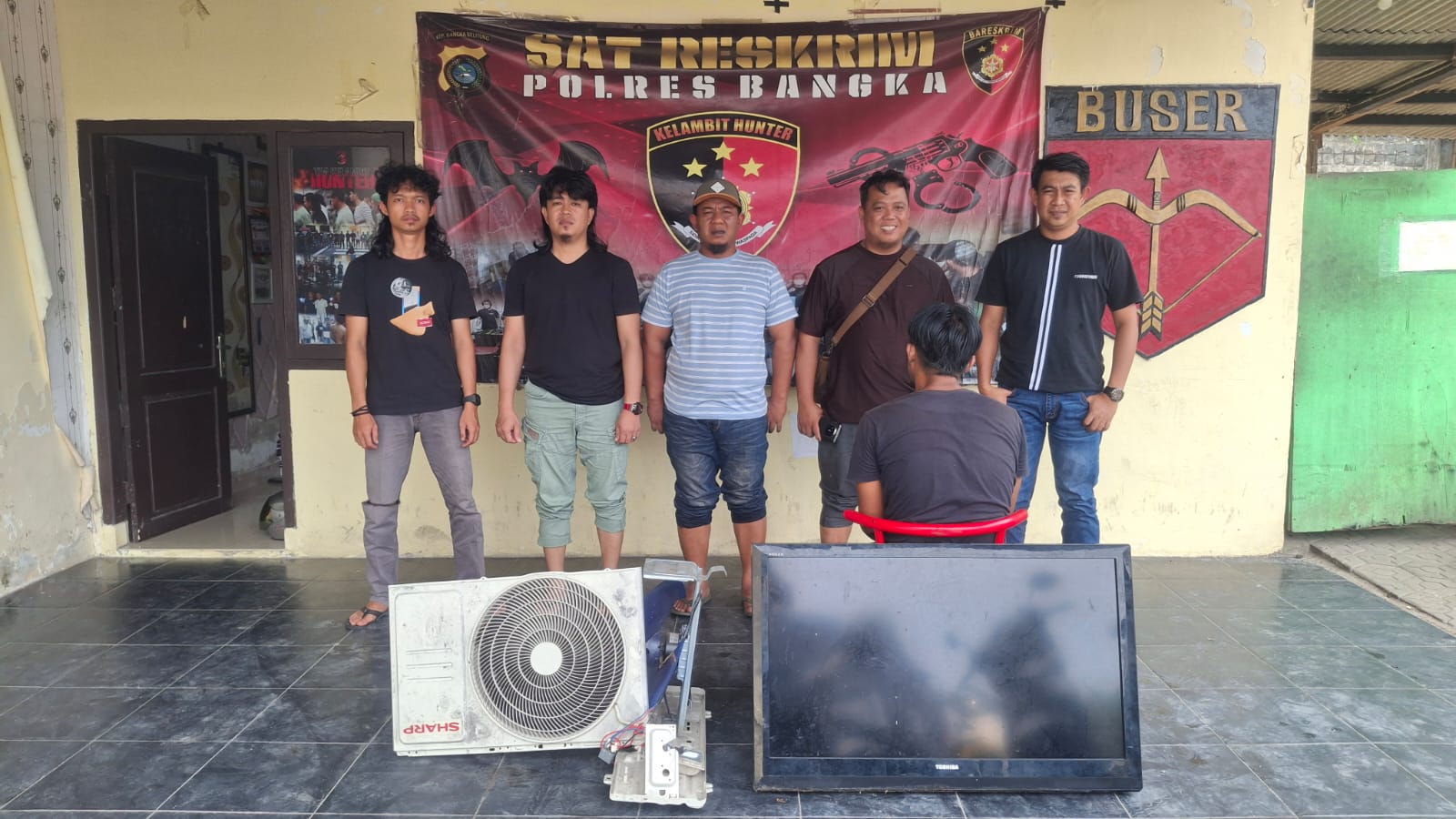 Dalam pengungkapan kasus tersebut, Polres Bangka turut mengamankan barang bukti berupa satu unit televisi merek Toshiba warna hitam serta satu unit mesin outdoor AC rusak merek Sharp warna putih.