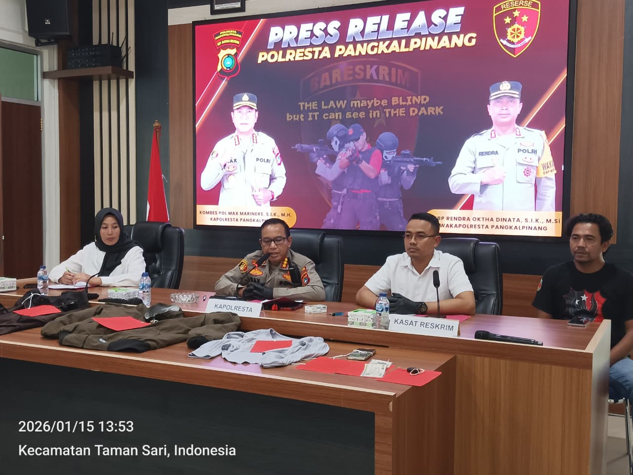 Kapolresta Pangkalpinang, Kombes Pol Max Mariners, mengumumkan keberhasilan penangkapan tersebut dalam konferensi pers di Aula SAR Polresta Pangkalpinang, Kamis (15/1/2026).