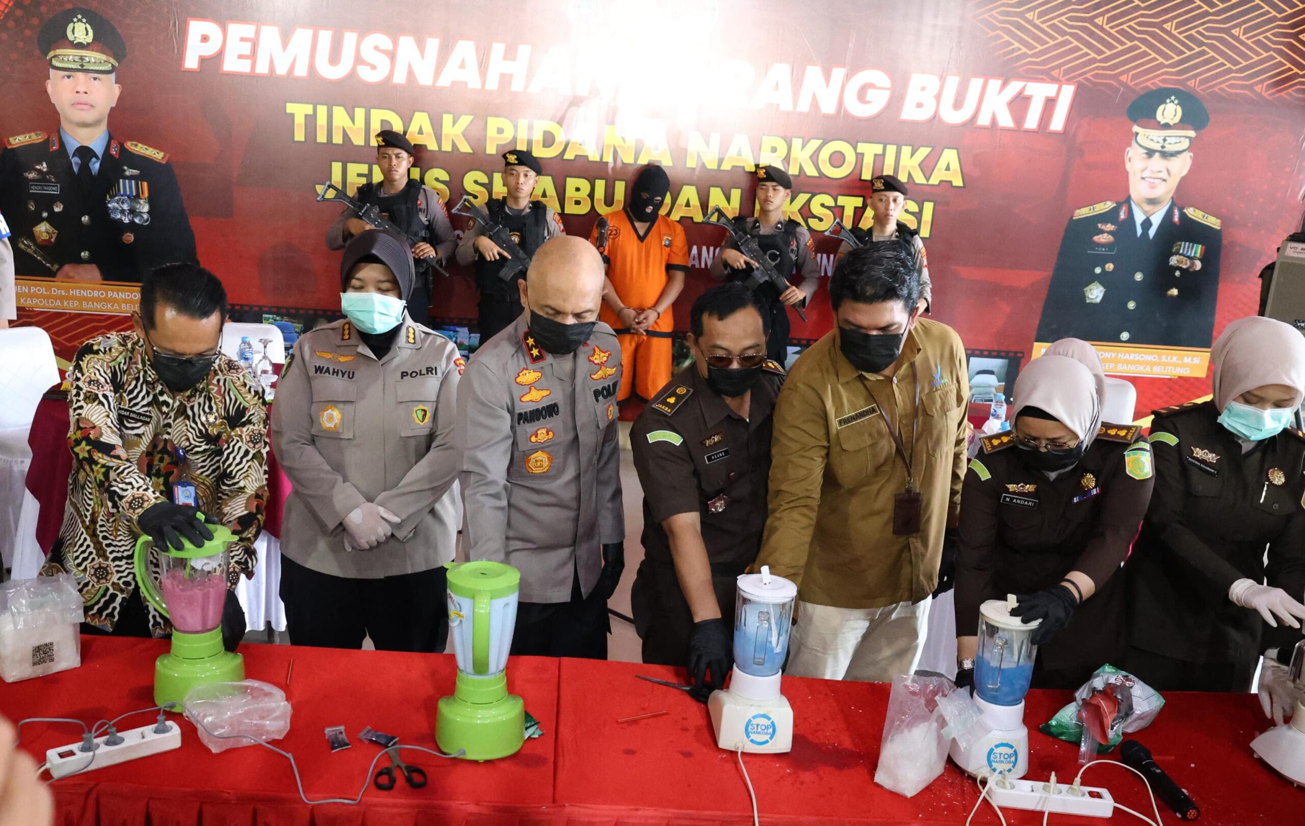 Sementara dalam pemusnahan tersebut, barang bukti narkoba baik sabu dan pil ekstasi dihancurkan dengan cara dimasukkan kedalam blender yang telah dicampur air dan zat kimia.